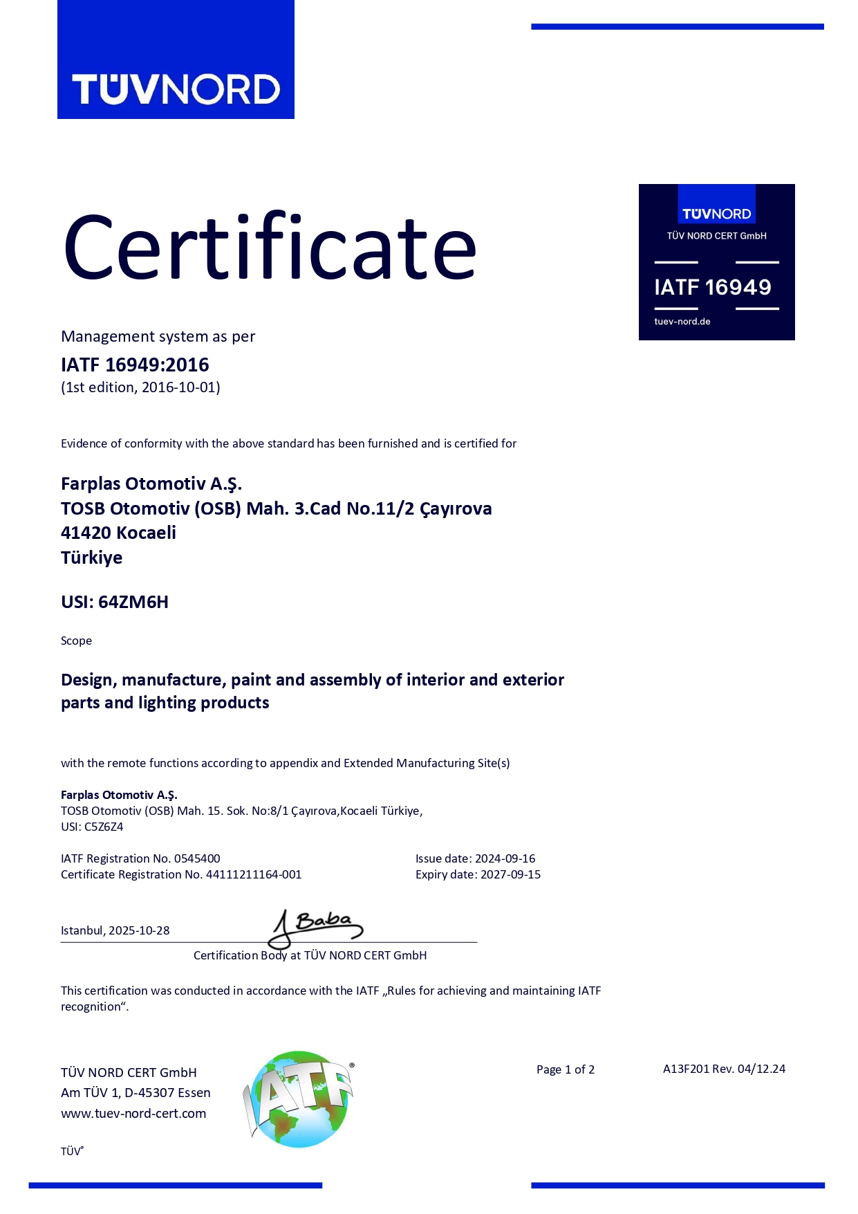 IATF 16949 Romania (Oarja Plant)